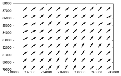 2) Après importation du fichier shapefile et traitements, le résultat de la commande matplotlib quiver() (trace un champ 2D avec des flèches) est :