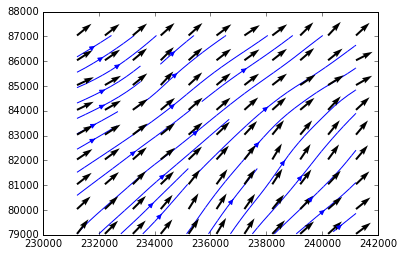 C’est le genre de concept qui fait mathématiquement peur avec des calculs de dérivées et/ou d’intégrales (mécanique des fluides, par exemple). Théoriquement les notions ont été vues à l’école et sortent du cadre de cet article. Je laisse donc à d’autres, plus qualifiés que moi, le soin de les expliquer. Heureusement, matplotlib dispose de la commande pour faire cela simplement, streamplot(), mais cela ne vous dispense pas du fait de comprendre ce que vous faites avant de l’utiliser, sinon... (quelques liens sur les traitements Python dans le domaine spatial ou des plugins QGIS sont données en fin d'article)