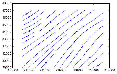 from shapely.geometry import LineString, mappingimport fiona# lignes de résultat de la commande streamplot()lines = test.lines.get_paths()from fiona.crs import from_epsg# définition du schéma du nouveau shapefilemonschema = {'geometry': 'LineString', 'properties': {'id' : 'int:2'}}# définition du crs du nouveau shapefilecrs = from_epsg(31370)# création du shapefile résultantwith fiona.open('stramplot_Leon3det05_1.shp','w',driver='ESRI Shapefile', crs=crs,schema= monschema) as sortie:for n,l in enumerate(lines):# le résultat de l.vertices est un array Numpyvertices = [(i[0], i[1]) for i in zip(l.vertices.T[0],l.vertices.T[1])]geom = mapping(LineString(vertices))prop = {'id': n}sortie.write({'geometry':geom, 'properties': prop})